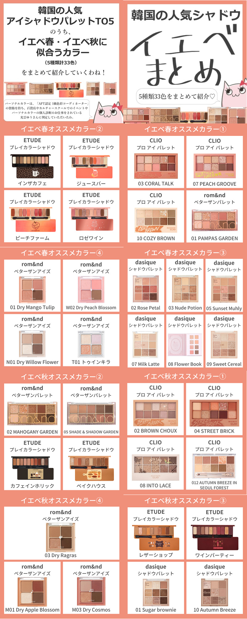 キュル美 プチプラコスメ 100均コスメ愛用の元美容部員 人気韓国アイシャドウtop5イエベ春 イエベ秋にオススメのカラーまとめ 今回は人気韓国アイシャドウtop5のうちイエベ春 イエベ秋に似合うカラー 5種類計33色 を紹介していくわ 韓国コスメ
